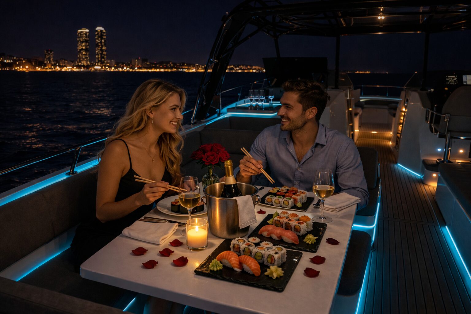 La mer devient votre écrin. À bord d’un yacht élégant, laissez les flots bercer votre nuit et les étoiles veiller sur vos rêves. Champagne, coucher de soleil et horizon infini — une parenthèse d’amour hors du temps.